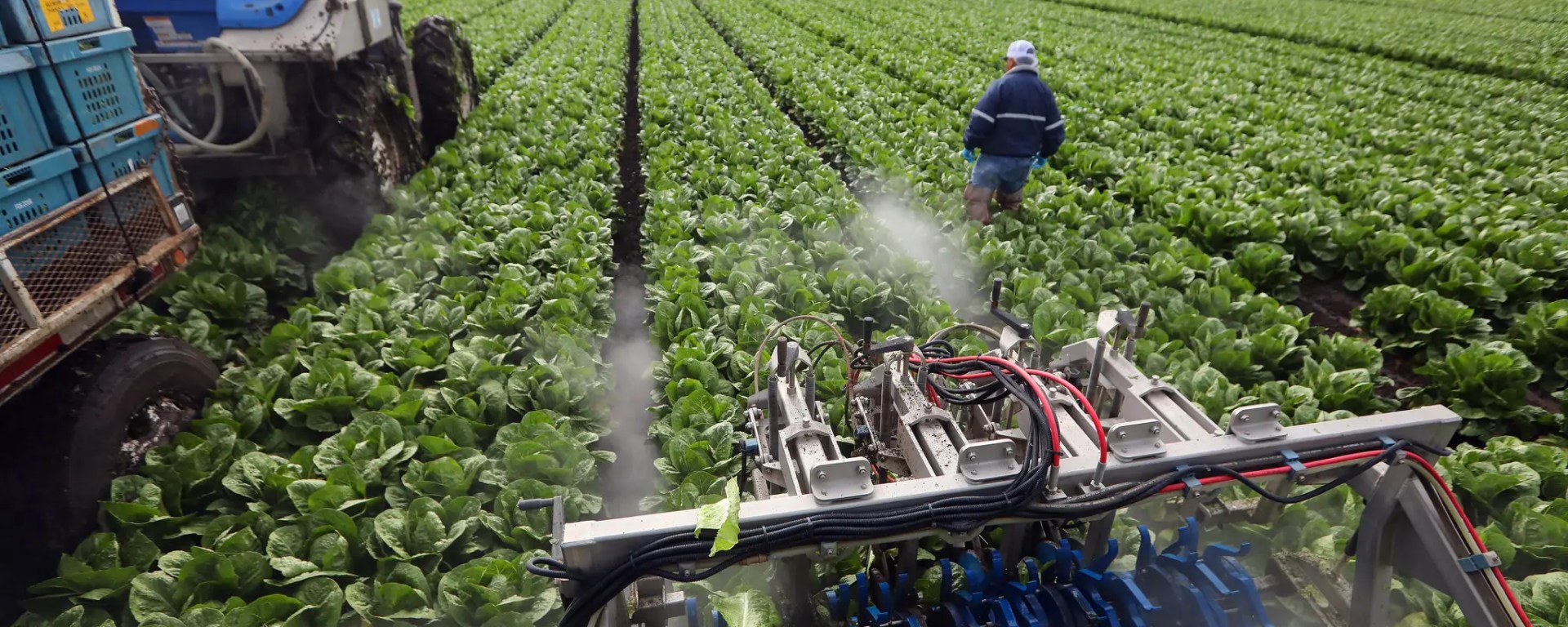 An automated harvesting machine at Taylor Farms in Salinas, Calif., uses a high pressure water stream to cut romaine lettuce heads. It replaces a crew of many farmworkers.